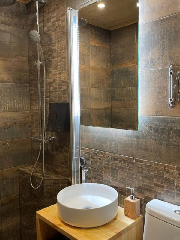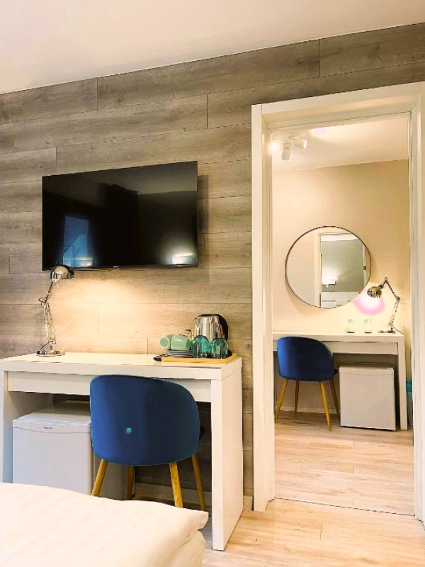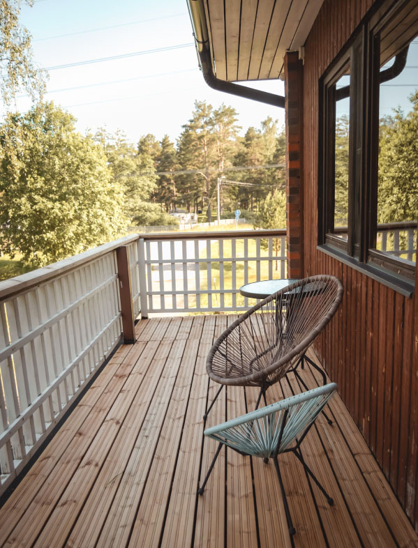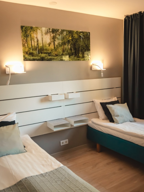 Windows overlook the greenery of the local forest. This 2-bedroom Family room can sleep up to 5 people with 2 rooms being separated by the door. You may choose to have a double bed (160 cm) or 2 single beds in one room, and in another there is one large single bed (120 cm) and a futon.